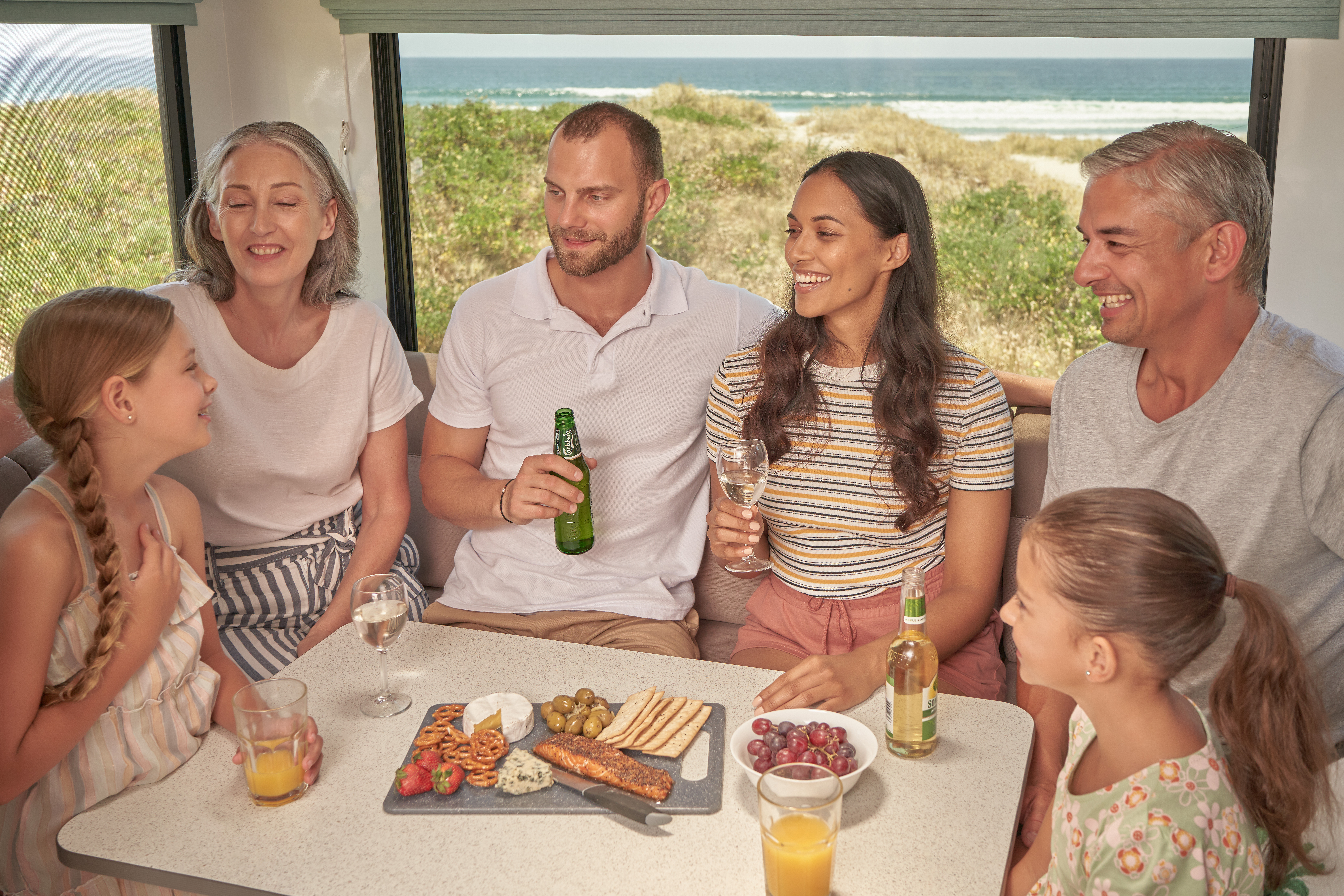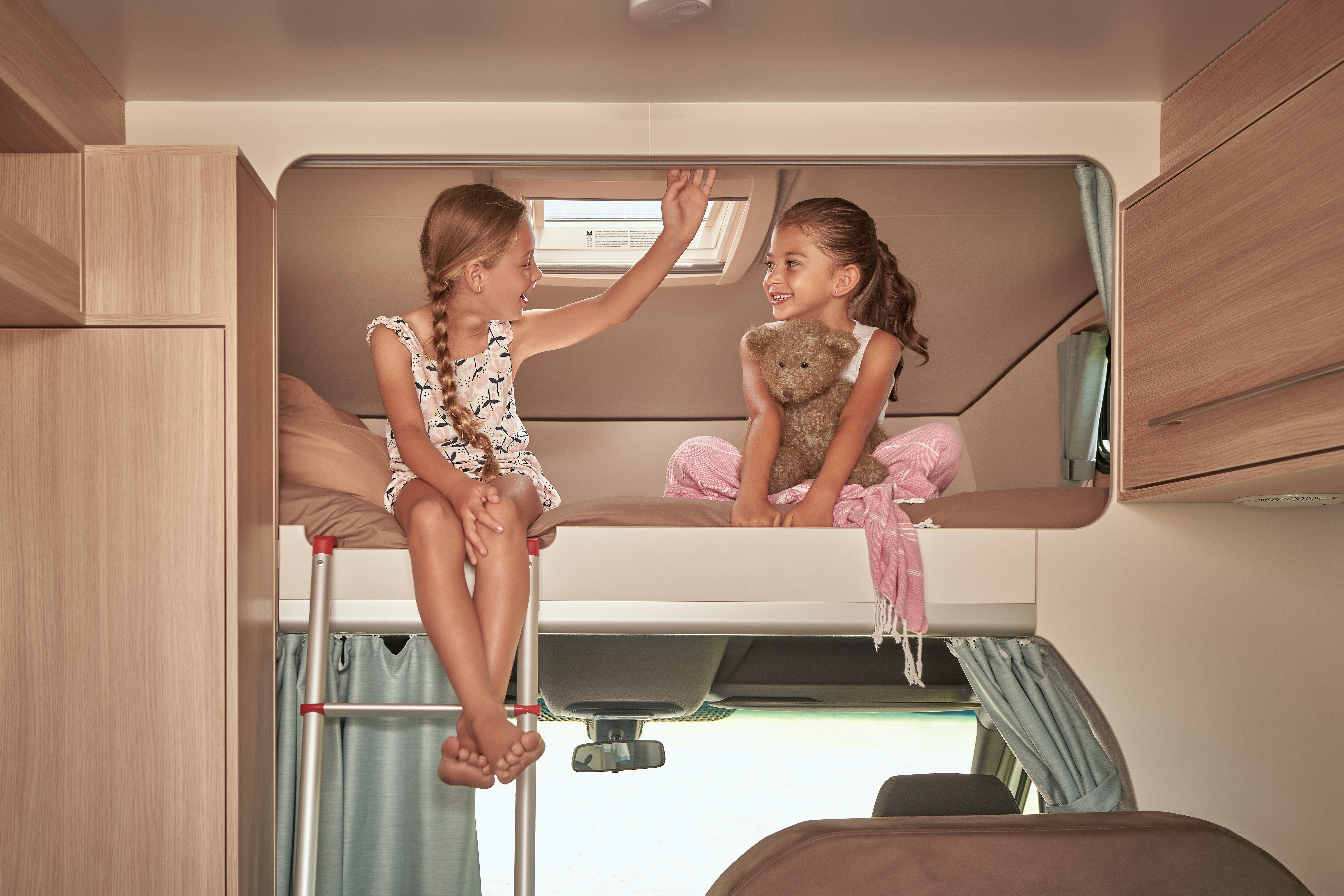 A maximum of two child restraints can be fitted to this camper. A child seat (from birth until approximately four years) or booster seat (for children aged between four and seven years) can be fitted to the forward-facing seats in the rear (where the two anchor points are positioned). Child and booster seats are an additional hire item. For more information on Child Restraints please read our guideline below: